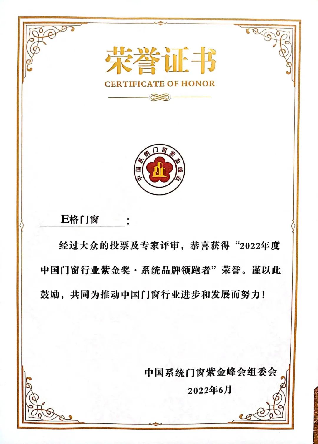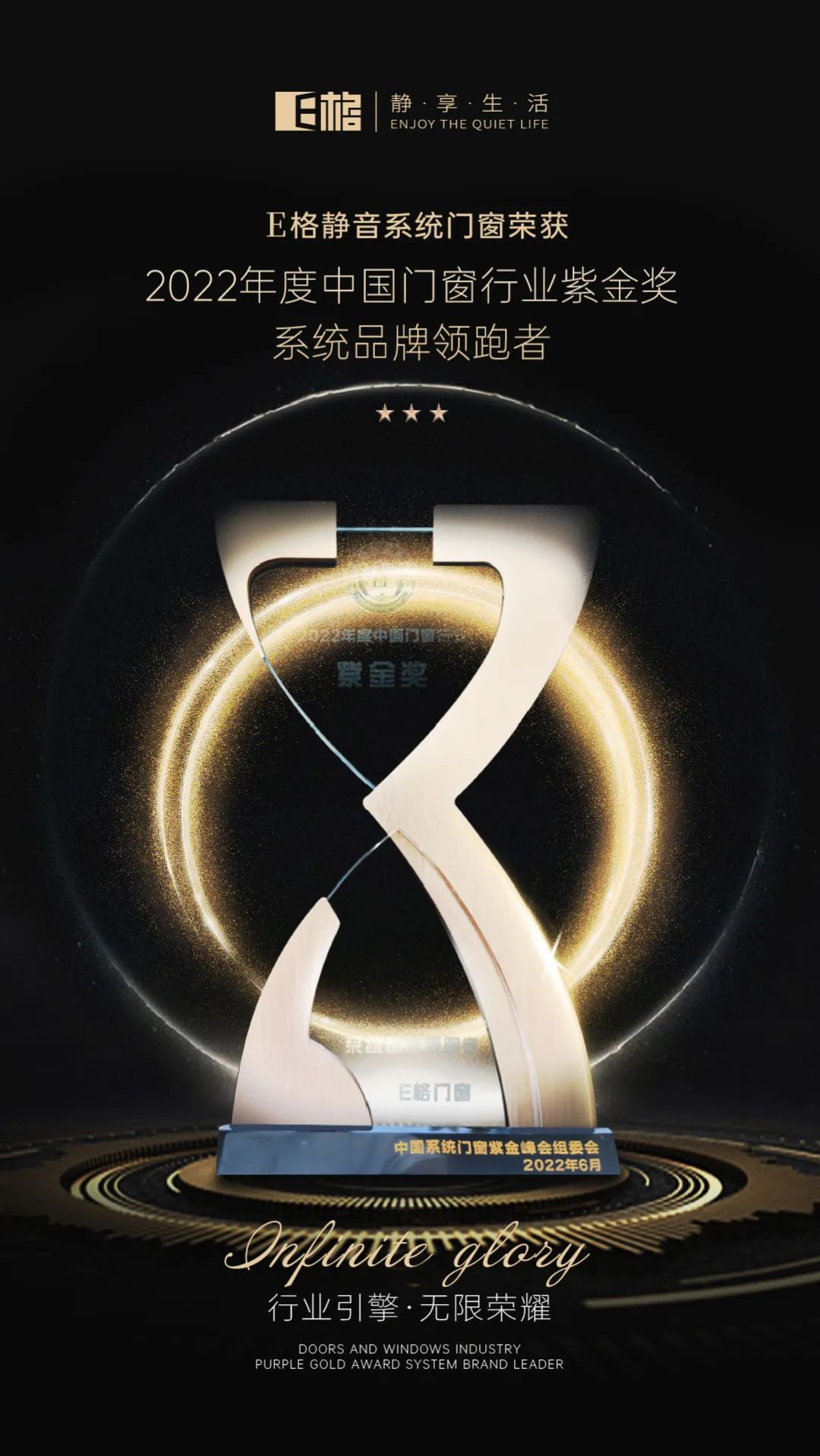 2022-08-172022年6月,由中國(guó)系統(tǒng)門(mén)窗紫金峰會(huì)主辦的第三屆中國(guó)門(mén)窗行業(yè)“紫金獎(jiǎng)”評(píng)選活動(dòng)中,E格靜音系統(tǒng)門(mén)窗力壓群雄榮獲“2022年度中國(guó)門(mén)窗行業(yè)紫金獎(jiǎng)·系統(tǒng)品牌領(lǐng)跑者”桂冠。